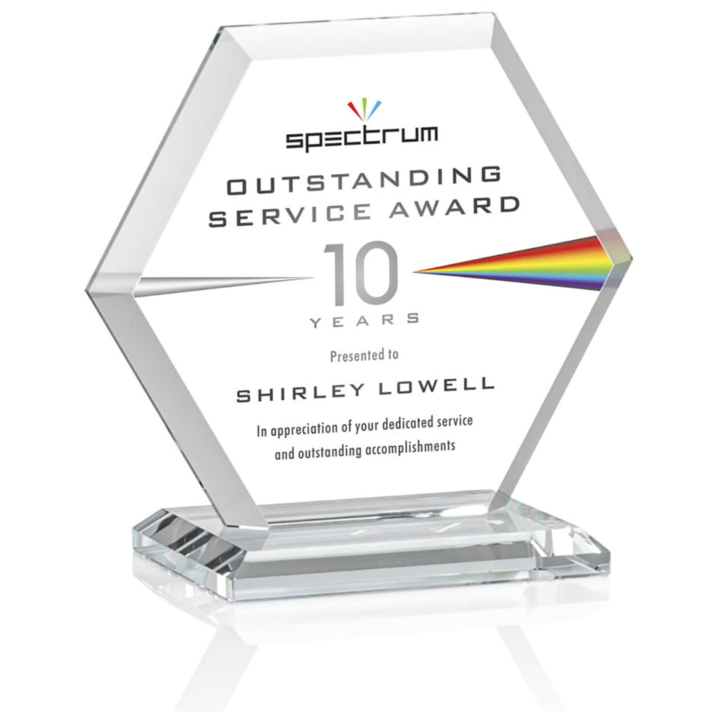 St. Regis Clear Barnett Award 5" x 5.25" x 3" - Printed with a custom message comes in multiple sizes to fit your special awards ceremony needs. The beveled Starfire Crystal hexagon is mounted on your choice of bases. Perfect to recognize outstanding service, anniversaries, or anything you choose. Order before your next event.The minimum order for this product is 1 piece.