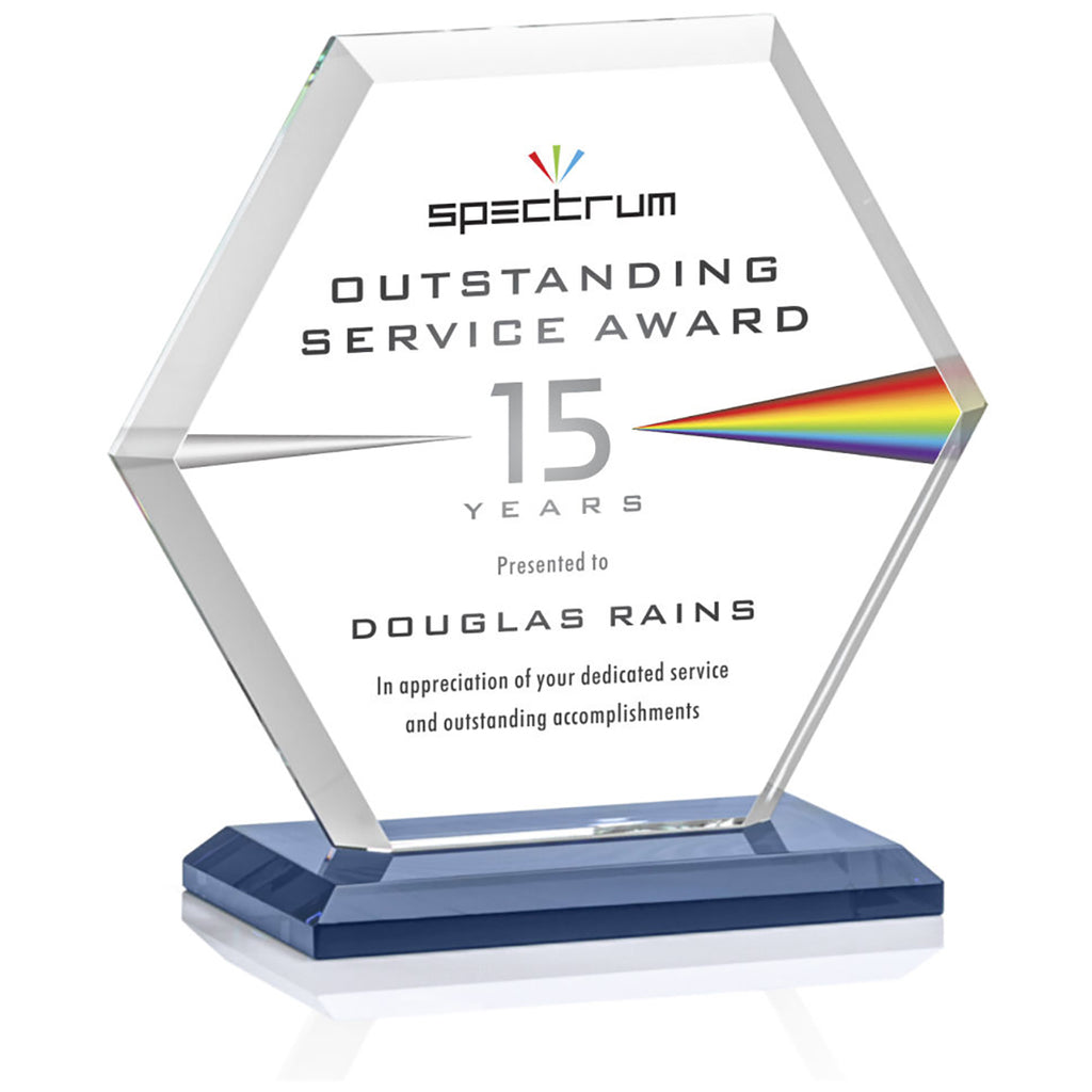 St. Regis Blue Barnett Award 6" x 6.25" x 3" - Printed with a custom message comes in multiple sizes to fit your special awards ceremony needs. The beveled Starfire Crystal hexagon is mounted on your choice of bases. Perfect to recognize outstanding service, anniversaries, or anything you choose. Order before your next event.The minimum order for this product is 1 piece.
