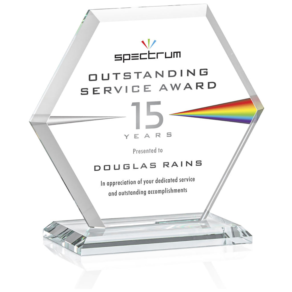 St. Regis Clear Barnett Award 6" x 6.25" x 3" - Printed with a custom message comes in multiple sizes to fit your special awards ceremony needs. The beveled Starfire Crystal hexagon is mounted on your choice of bases. Perfect to recognize outstanding service, anniversaries, or anything you choose. Order before your next event.The minimum order for this product is 1 piece.