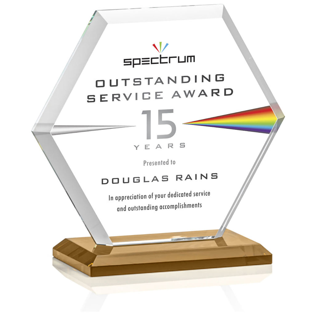 St. Regis Amber Barnett Award 6" x 6.25" x 3" - Printed with a custom message comes in multiple sizes to fit your special awards ceremony needs. The beveled Starfire Crystal hexagon is mounted on your choice of bases. Perfect to recognize outstanding service, anniversaries, or anything you choose. Order before your next event.The minimum order for this product is 1 piece.