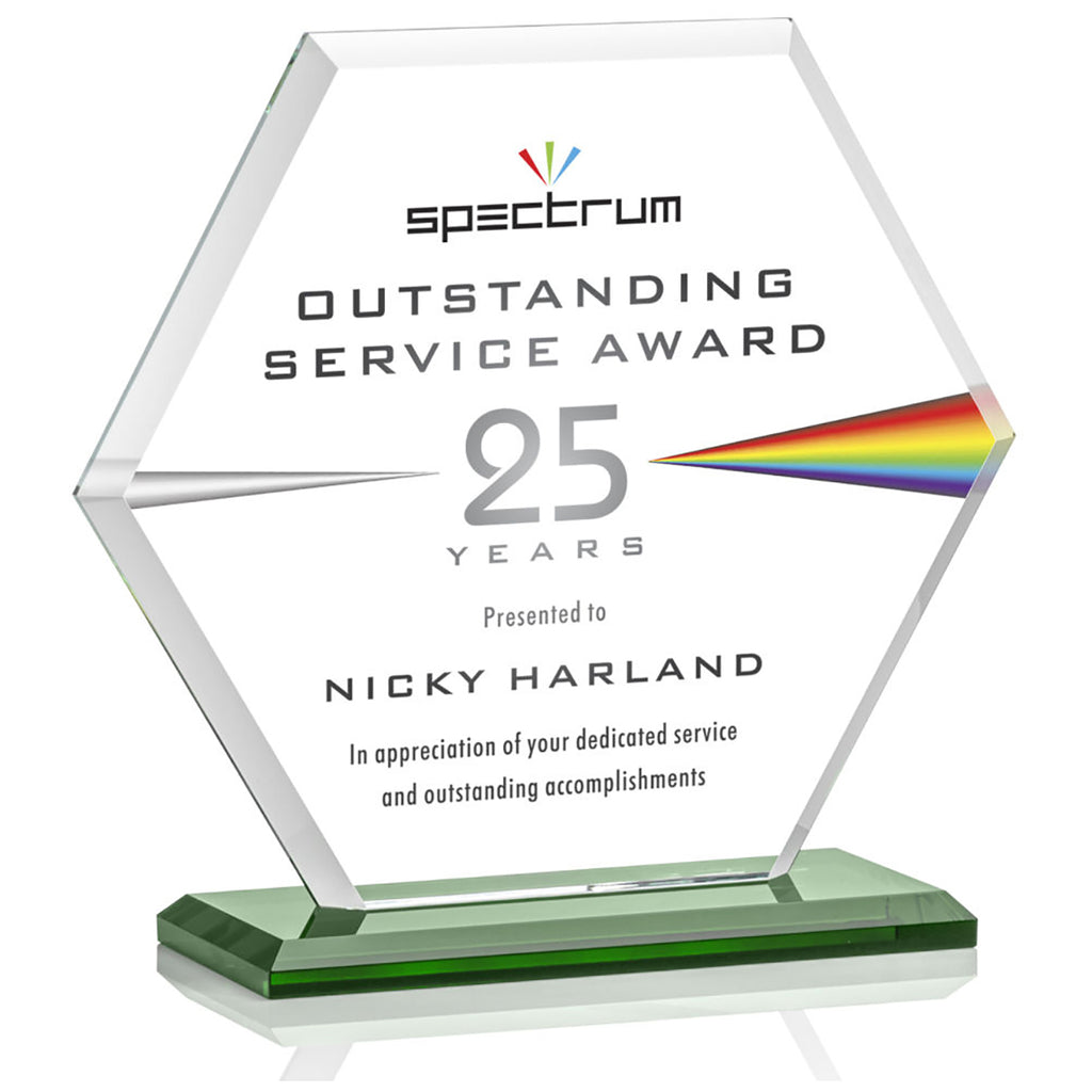 St. Regis Green Barnett Award 8" x 8.25" x 3" - Printed with a custom message comes in multiple sizes to fit your special awards ceremony needs. The beveled Starfire Crystal hexagon is mounted on your choice of bases. Perfect to recognize outstanding service, anniversaries, or anything you choose. Order before your next event.The minimum order for this product is 1 piece.
