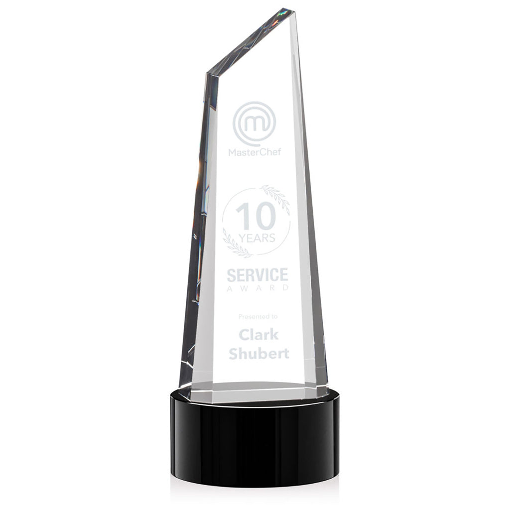 Create a custom message for the St. Regis Black Akron Tower Award 4.5" x 12" x 4.5" with Base - Laser Engraved to give an award that is as special as the recipient. This trapezoidal tower is anchored with a thick optical crystal bottom that tapers to a peak to create an eye-catching design. Perfect for companies, services awards, or sporting championships.The minimum order for this product is 1 piece.