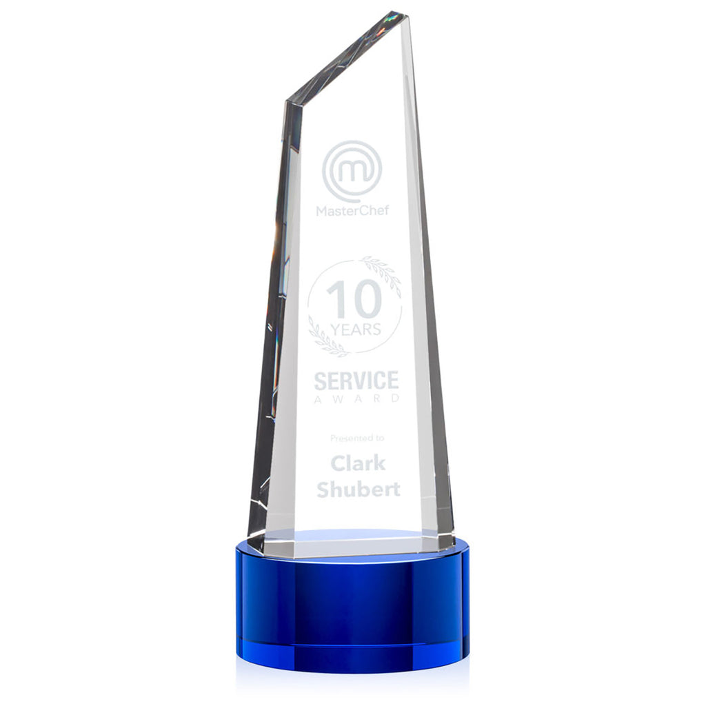 Create a custom message for the St. Regis Blue Akron Tower Award 4.5" x 12" x 4.5" with Base - Laser Engraved to give an award that is as special as the recipient. This trapezoidal tower is anchored with a thick optical crystal bottom that tapers to a peak to create an eye-catching design. Perfect for companies, services awards, or sporting championships.The minimum order for this product is 1 piece.
