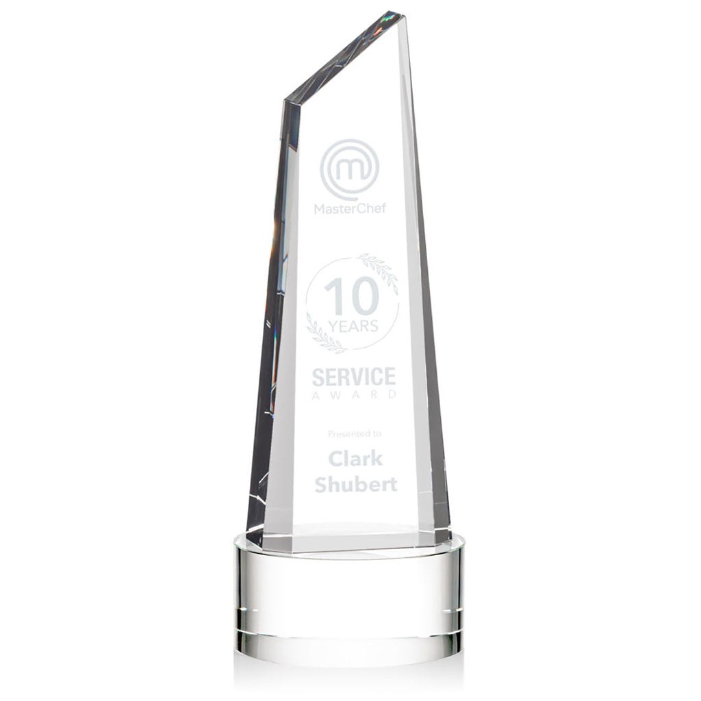 - Stunning trapezoidal tower award is anchored with a thick optical crystal bottom that tapers to a peak.