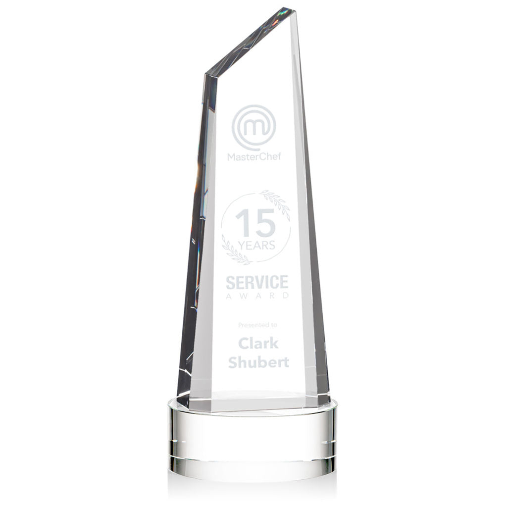 Create a custom message for the St. Regis Clear Akron Tower Award 5" x 14" x 5" with Base - Laser Engraved to give an award that is as special as the recipient. This trapezoidal tower is anchored with a thick optical crystal bottom that tapers to a peak to create an eye-catching design. Perfect for companies, services awards, or sporting championships.The minimum order for this product is 1 piece.