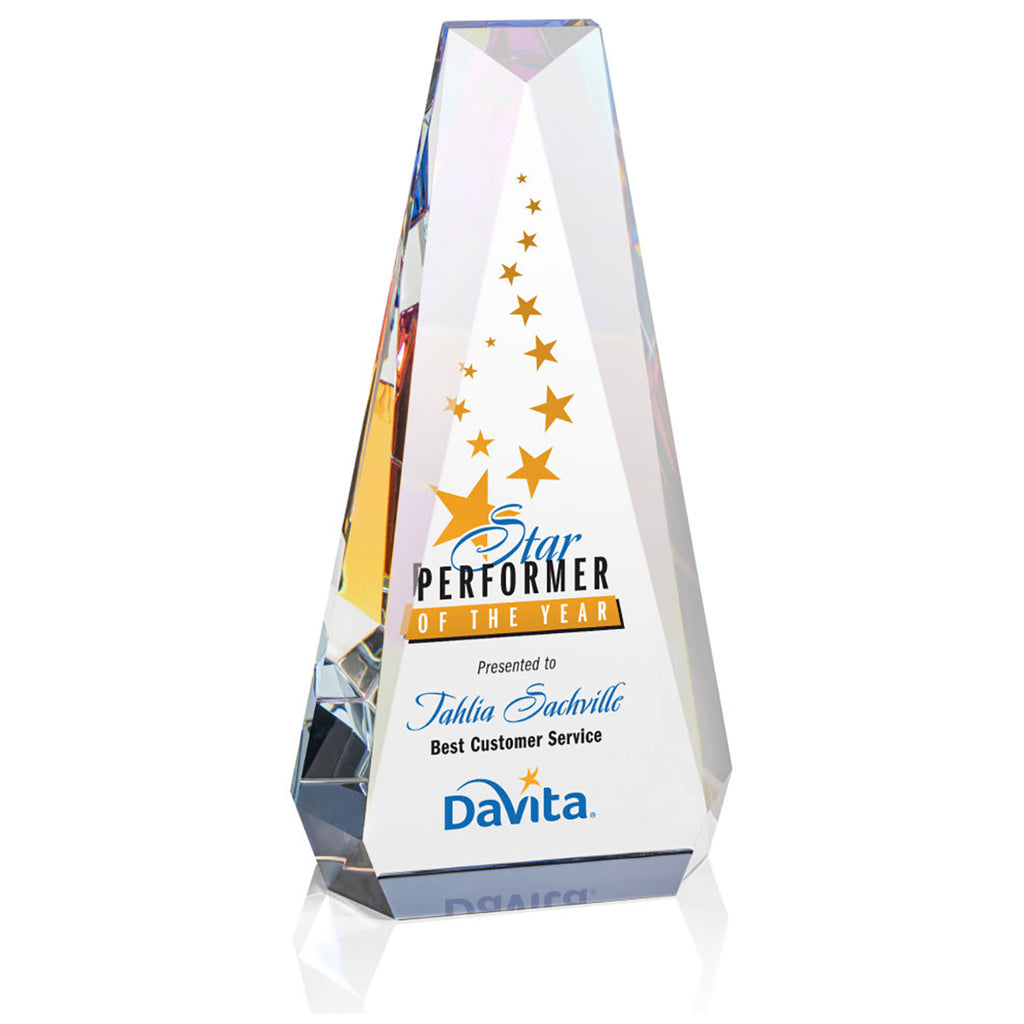 • The multi-color base reflects a brilliant rainbow of colors throughout the dynamic bevels of the award.