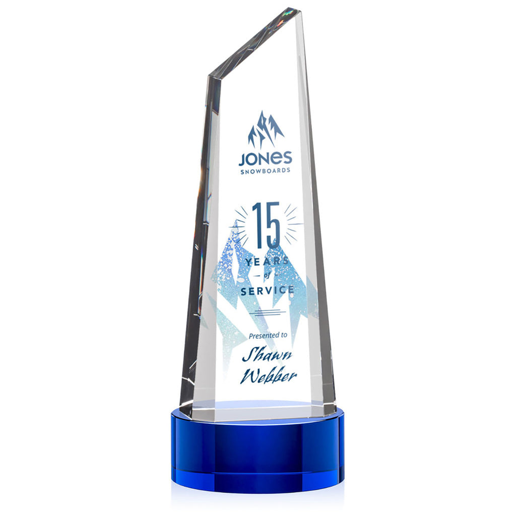 Create a custom message for the St. Regis Blue Akron Tower Award 5" x 14" x 5" with Base - Printed to give an award that is as special as the recipient. This trapezoidal tower is anchored with a thick optical crystal bottom that tapers to a peak to create an eye-catching design. Perfect for companies, services awards, or sporting championships.The minimum order for this product is 1 piece.