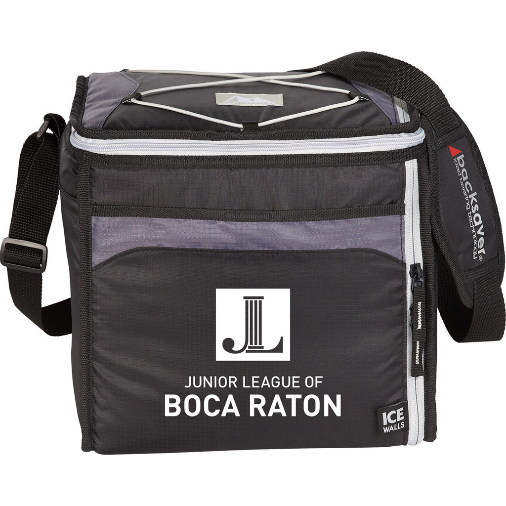 Turn your office into an after hours party by stocking your favorite adult beverages inside of the Arctic Zone Black 24 Can Ice Wall Cooler. Four ice packs slide into the walls within the cooler to preserve the cool freshness of all types of canned beverages. Use the exterior lunch pocket to keep a can opener and electronic devices for quick access. The adjustable Backsaver shoulder strap reduces the strain of carrying heavy loads. Ultra Safe lining never leaks and takes little time to clean. Attach your corporate logo to get the word out about your products and services. The minimum order for this product is 24 pieces.Highlights