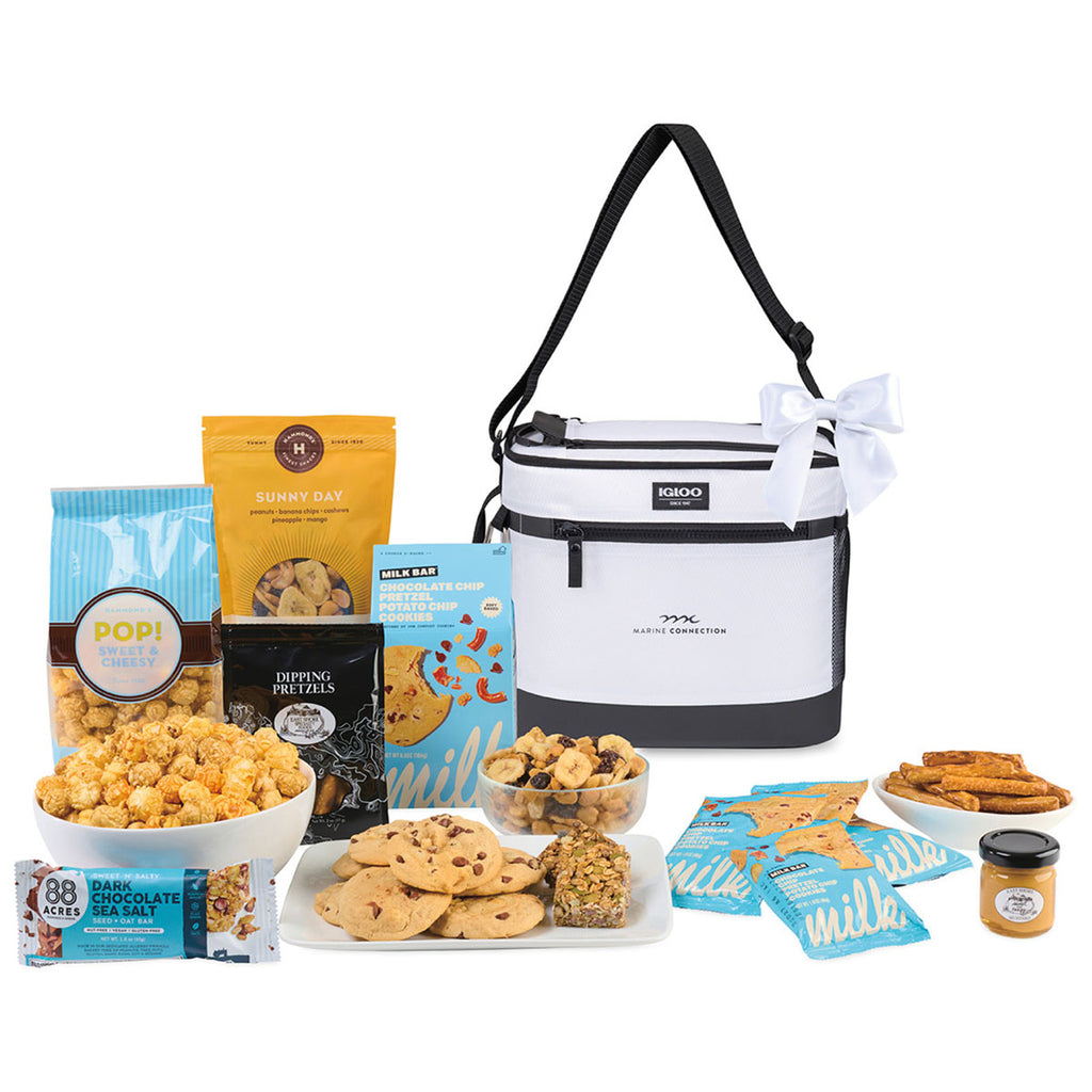 Add your company's custom logo to the Gourmet Expressions Igloo White Maddox Marvel Gourmet Cooler to create a personalized gift that is great for important customers or clients. Along with a stylish portable cooler, this set Includes an array of sweet and salty gourmet snacks that everyone will want to get their hands on.