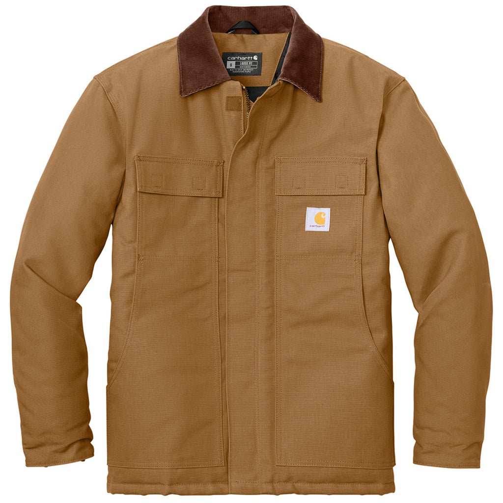 Design a custom logo for the Carhartt Men's Carhartt Brown Duck Traditional Coat. This coat is made for those who work and play hard in life. Gear up for the cold with the wind fighter technology and quilted nylon lining. Perfect for hunters, fishermen, and those who work outdoors. Place an order today because these will go fast.