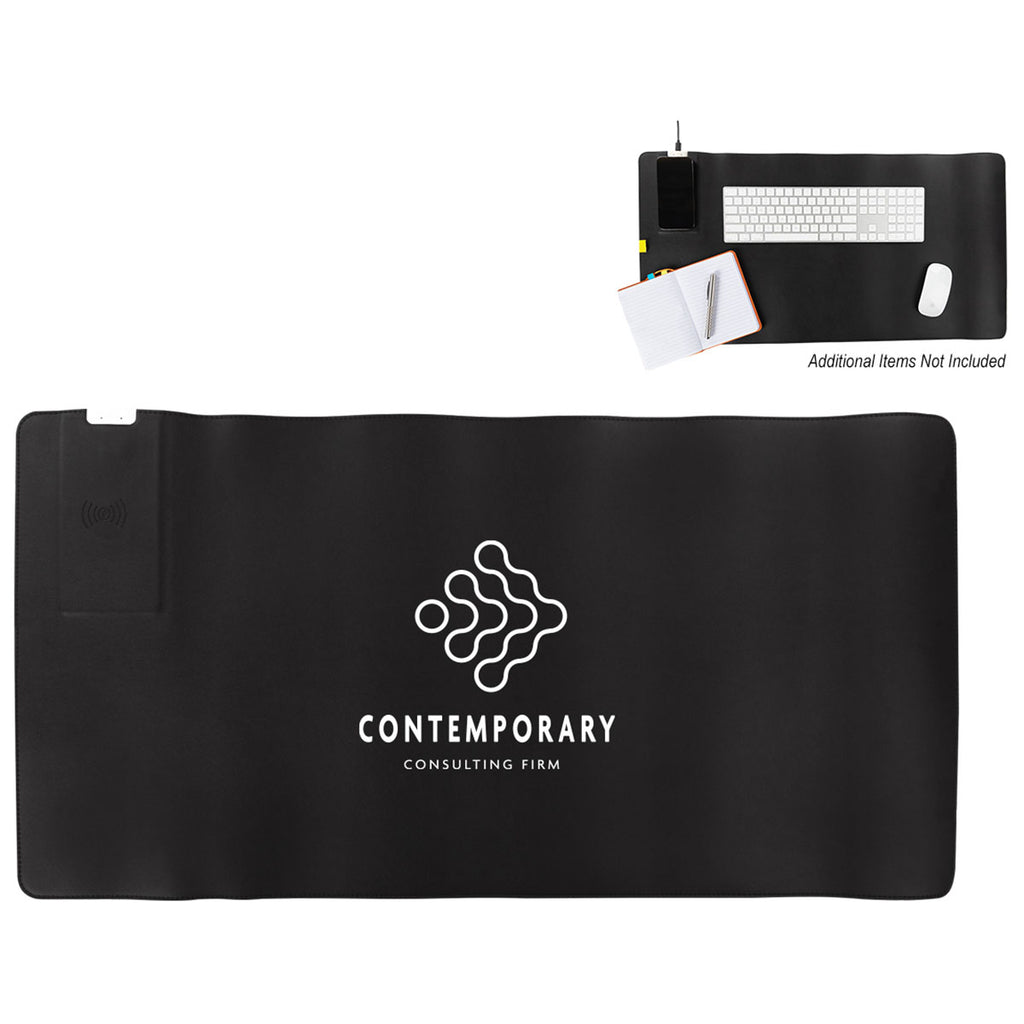Easily charge your Qi-enabled devices with a corporate logoed Hit Black Desk Mat With 15W Wireless Charger. Simply place your compatible device on the charging pad and keep working. Perfect for the office as this can be used as a mouse pad and protects desks from scratches or sold to customers so they can charge with ease as well.