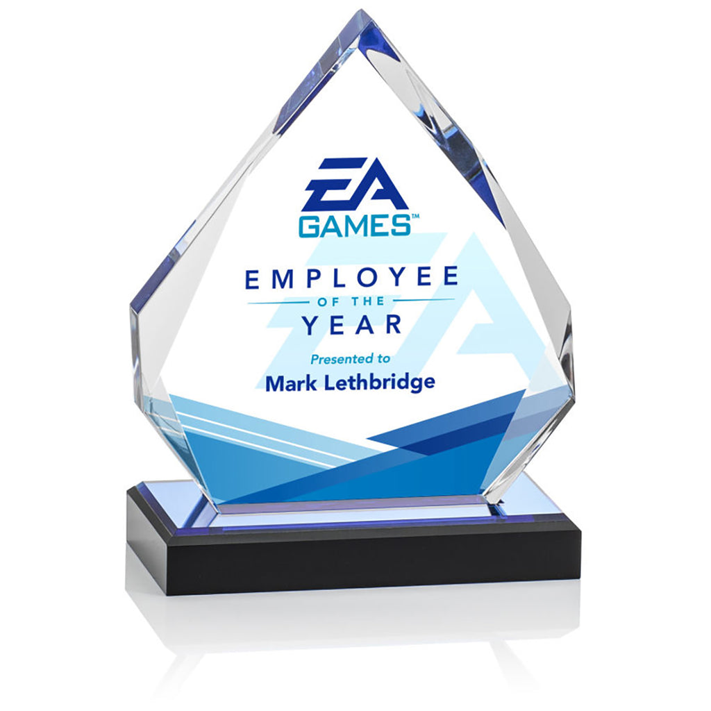 The St. Regis Blue Beckenham Award 5.25" x 6.75" with Standard Base - Printed with a custom or corporate logo is a wonderful way to recognize a special achievement or goal. The gorgeous ebony base with a golden reflective top radiates gold through the interchanging facets toward the peak. Perfect for employment anniversaries, outstanding service, and top marks.