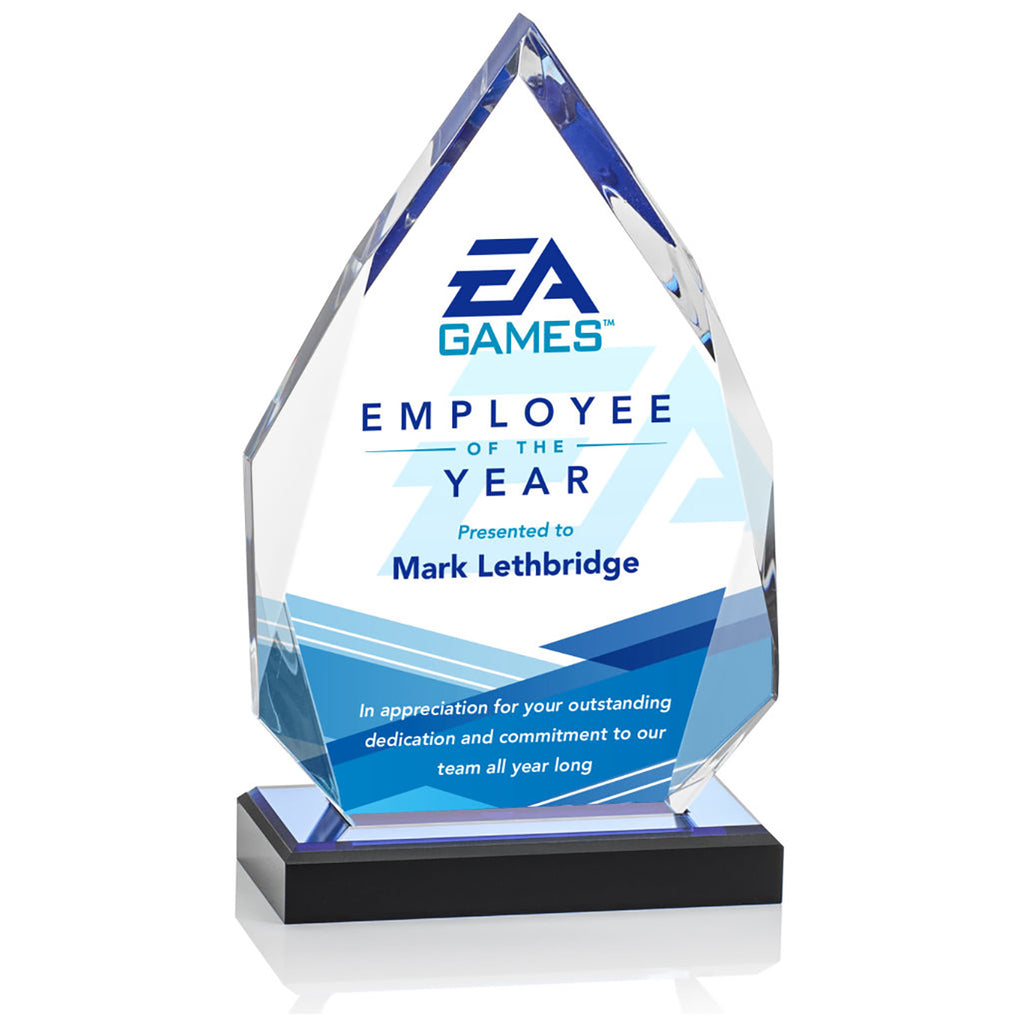The St. Regis Blue Beckenham Award 5.25" x 8.75" with Standard Base - Printed with a custom or corporate logo is a wonderful way to recognize a special achievement or goal. The gorgeous ebony base with a golden reflective top radiates gold through the interchanging facets toward the peak. Perfect for employment anniversaries, outstanding service, and top marks.The minimum order for this product is 1 piece.