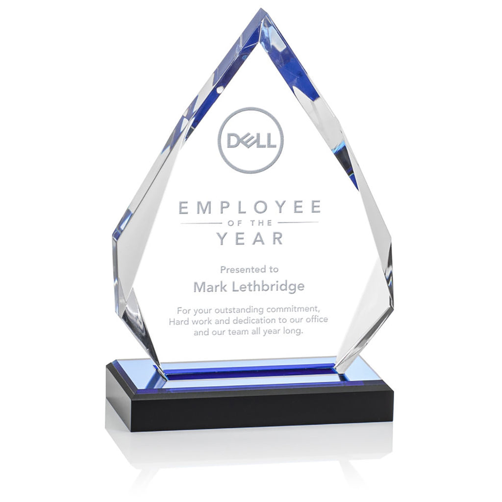 The St. Regis Blue Beckenham Award 5.25" x 7.75" with Standard Base - Laser Engraved with a custom or corporate logo is a wonderful way to recognize a special achievement or goal. The gorgeous ebony base with a golden reflective top radiates gold through the interchanging facets toward the peak. Perfect for employment anniversaries, outstanding service, and top marks.The minimum order for this product is 1 piece.