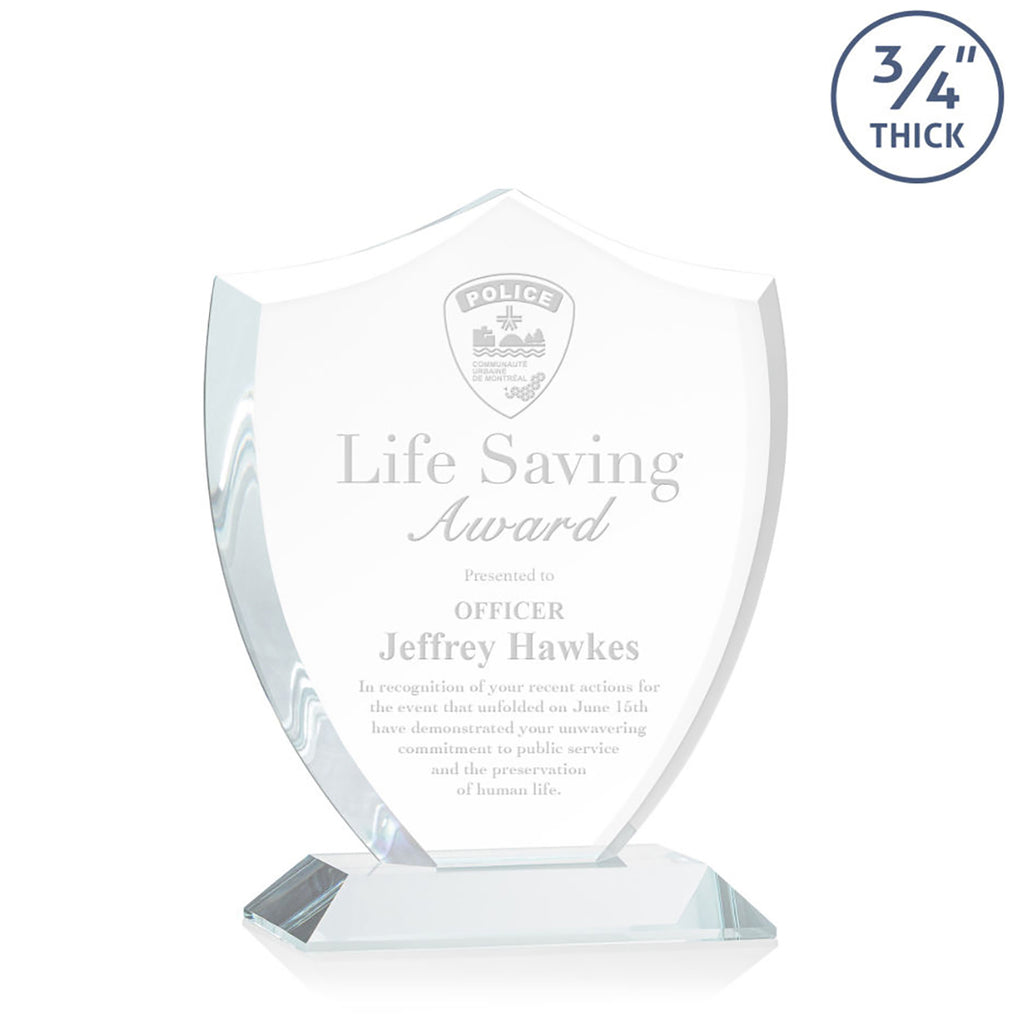 Choose your custom design for the St. Regis Clear Scudo Shield Award 6.25" x 7.75" x 3" with Standard Base - Laser Engraved to show appreciation to those who show excellence daily. The shield design makes these ideal for first responders, law enforcement, and others who focus on protection, authority, and stability in the community. Order early so you do not miss out.The minimum order for this product is 1 piece.