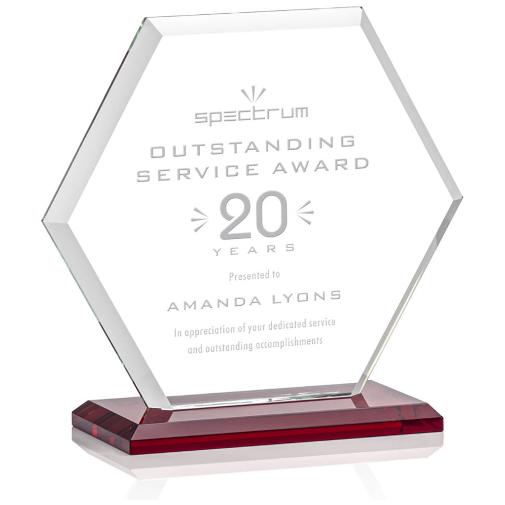 St. Regis Red Barnett Award 7" x 7.25" x 3" - Laser Engraved with a custom message comes in multiple sizes to fit your special awards ceremony needs. The beveled Starfire Crystal hexagon is mounted on your choice of bases. Perfect to recognize outstanding service, anniversaries, or anything you choose. Order before your next event.The minimum order for this product is 1 piece.