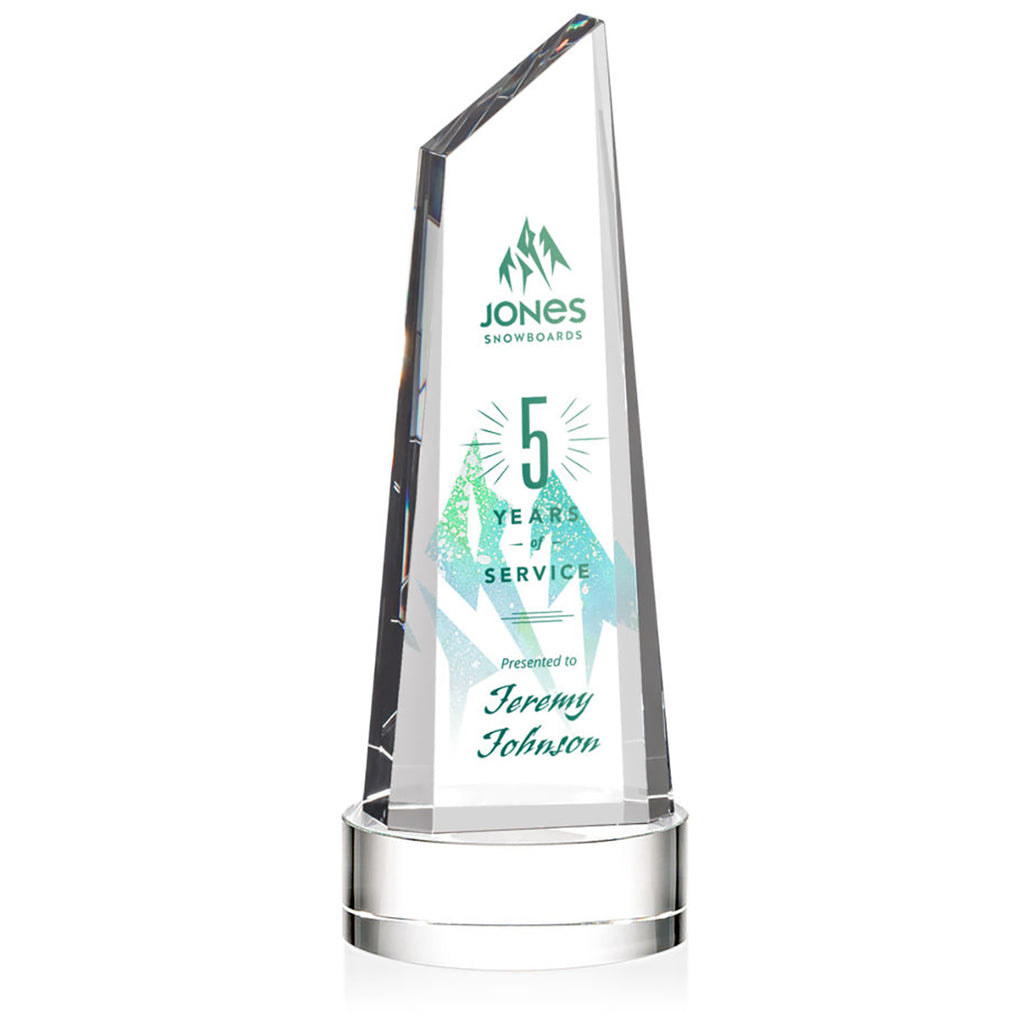 - Stunning trapezoidal tower VividPrint award is anchored with a thick optical crystal bottom that tapers to a peak.