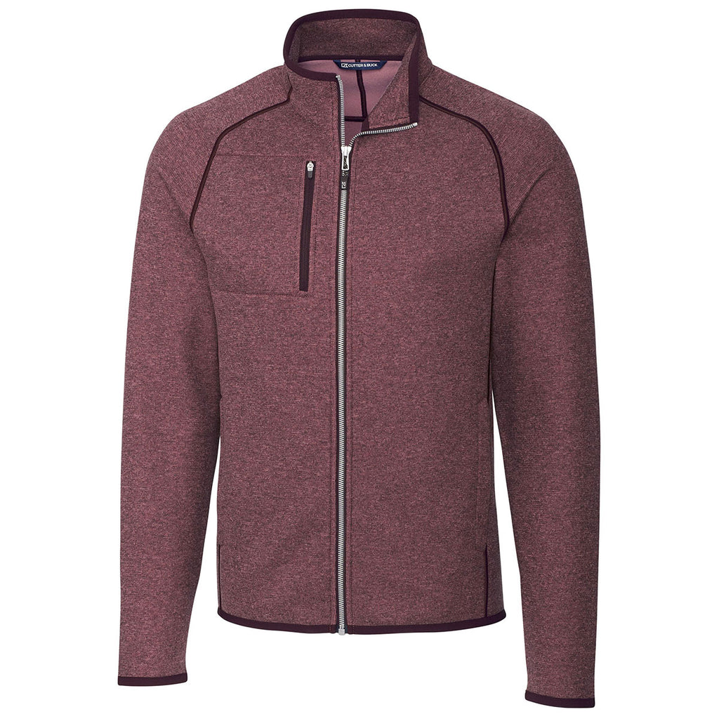 The Cutter & Buck Men's Bordeaux Heather Mainsail Jacket offers a modern style with ideal warmth. Add your custom logo to the front of the jacket and you can turn this already exceptional item into an advertising item for your company. This corporate apparel product is available in a variety of appealing colors with welcome features such as a 100% polyester material, sweater knit material, brushed fleece interior, mock neck full zip, zippered chest pocket, and CB logo at back yoke. This jacket makes an excellent employee apparel gift as well as to hand out as a giveaway gift at any upcoming corporate event.Highlights