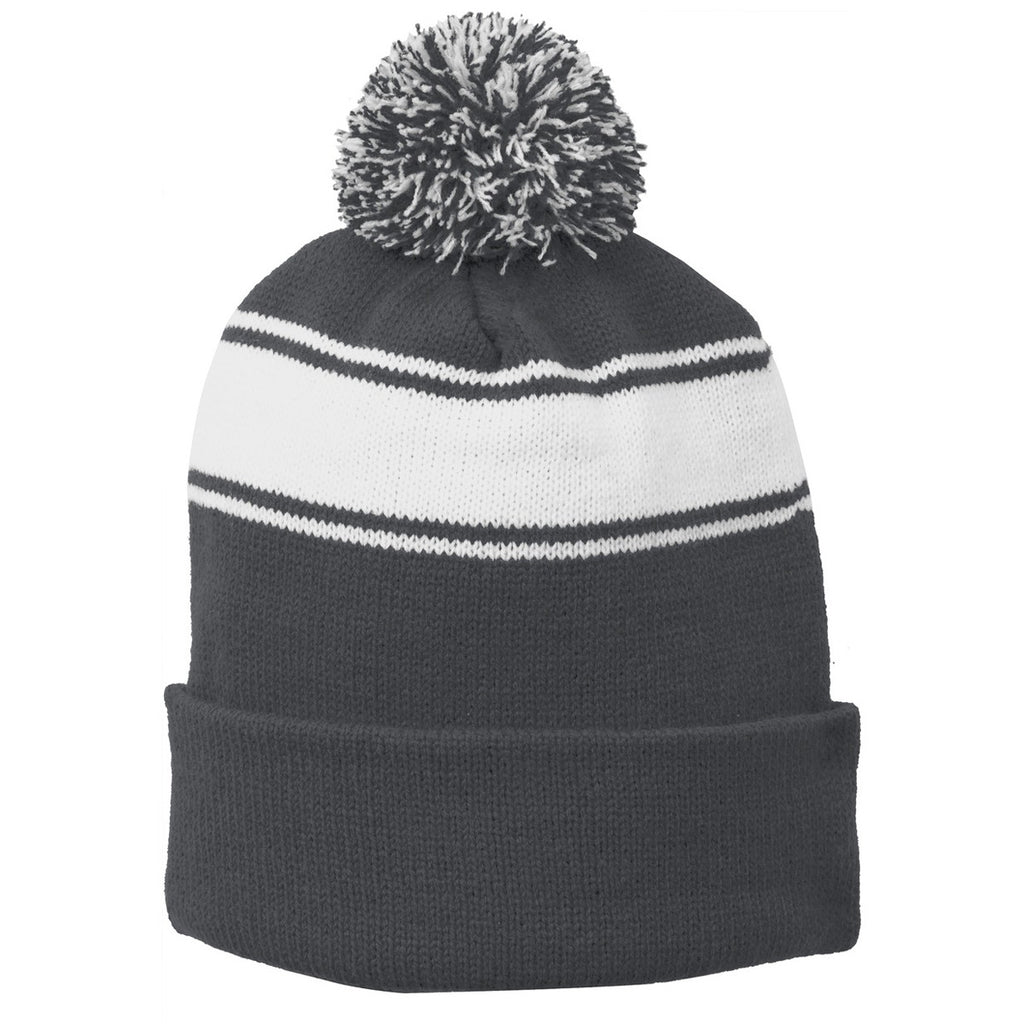 Sport-Tek Stripe Iron Grey/White Pom Pom Beanie