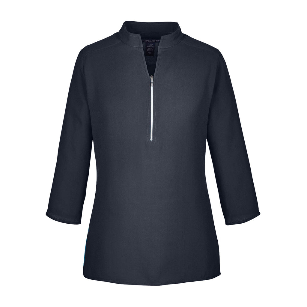 Refined and oh-so sleek, the Devon & Jones Women's Black Perfect Fit Three-Quarter Sleeve Crepe Tunic flaunts a delightfully feminine silhouette and lends fluidity to your look. Longer length is suitable for everyday activity and full spectrum of movement. It flaunts an always-flattering and silhouette ready to mix with your existing wardrobe for instant flair. Other features include double layer back yoke with center back pleat, front metal zipper and side slits. Create an immediate sense of recognition, deepen your corporate identity and build familiarity and trust for your brand by adding your company's logo to this crepe blouse.Highlights