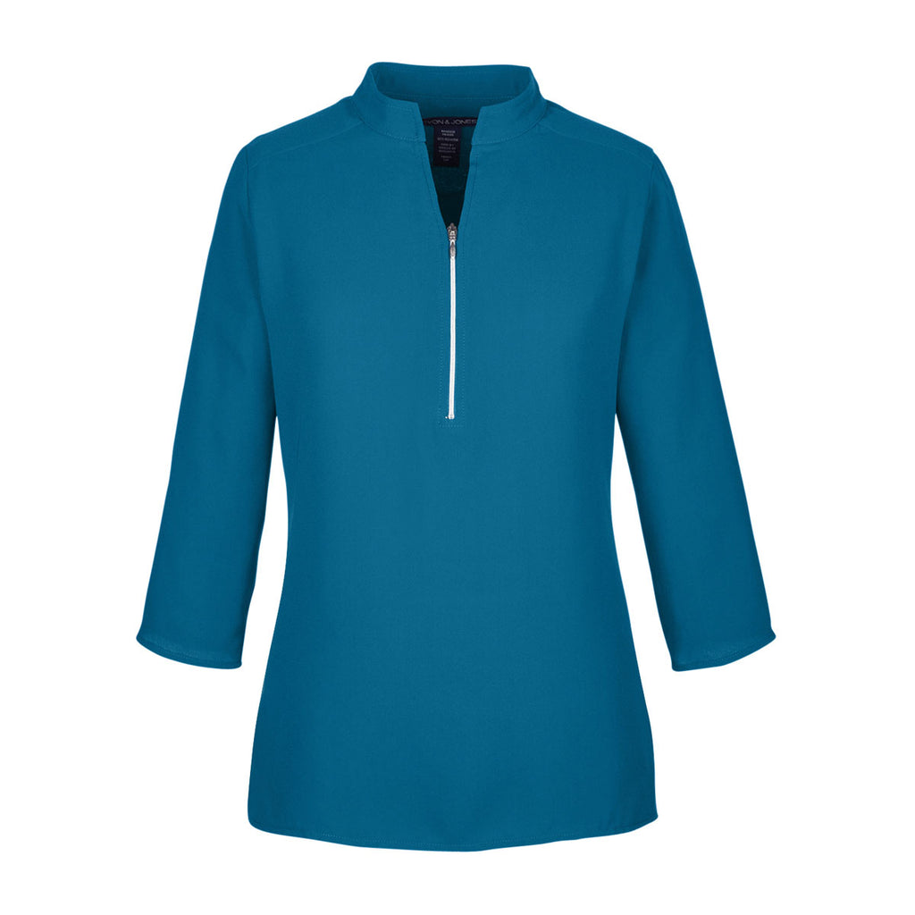 Refined and oh-so sleek, the Devon & Jones Women's Dark Teal Perfect Fit Three-Quarter Sleeve Crepe Tunic flaunts a delightfully feminine silhouette and lends fluidity to your look. Longer length is suitable for everyday activity and full spectrum of movement. It flaunts an always-flattering and silhouette ready to mix with your existing wardrobe for instant flair. Other features include double layer back yoke with center back pleat, front metal zipper and side slits. Create an immediate sense of recognition, deepen your corporate identity and build familiarity and trust for your brand by adding your company's logo to this crepe blouse.Highlights