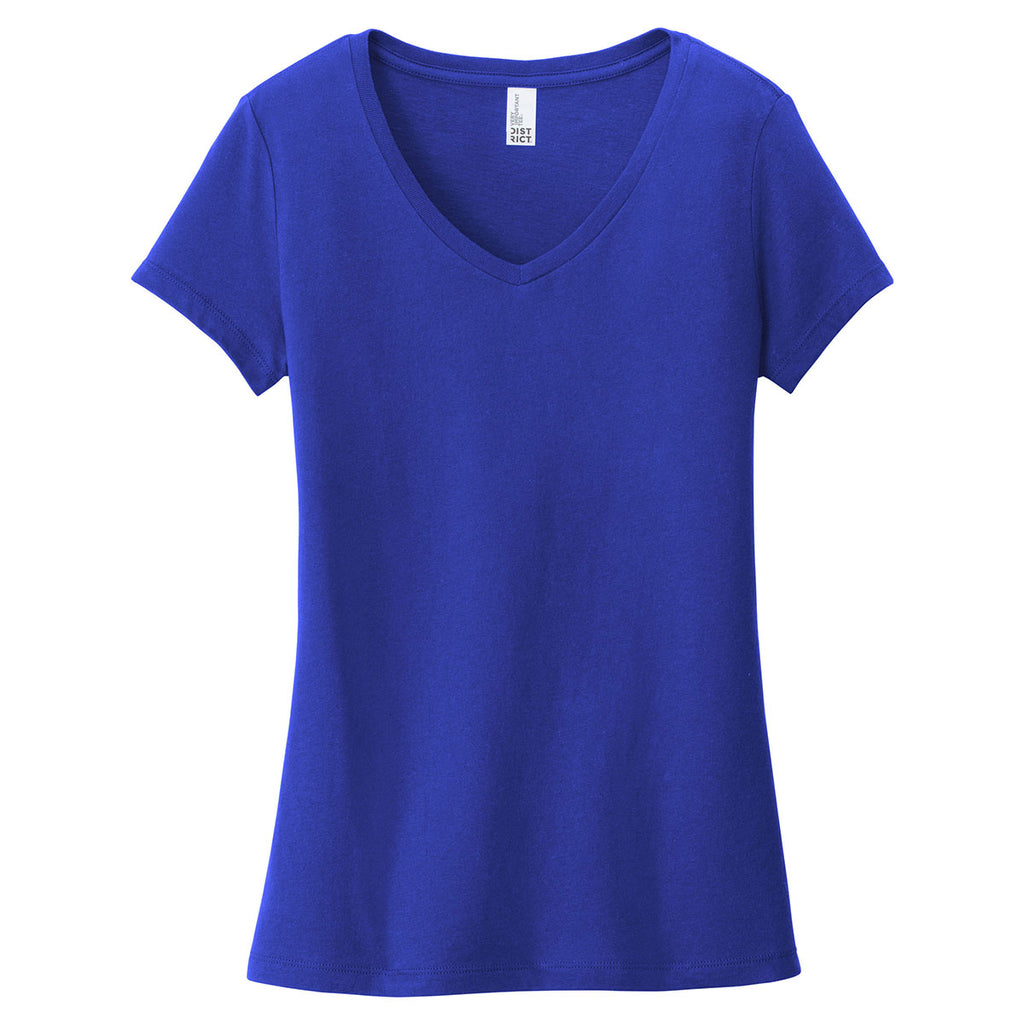You do not need to wear a tux to feel very important, when you order the decorated District Women's Deep Royal Very Important Tee V-Neck. The fashionable short sleeve shirt features shoulder to shoulder taping that presents a professional appearance for job candidates attending recruiting events. Attach a custom logo to raise the bar for marketing products and services at industry trade shows. Super soft 100% ring spun combed cotton resists rips and tears to give you go to corporate apparel for years to come. The slightly slimmer body and shorter sleeves make the tee v-neck perfect for active outdoor enthusiasts.Highlights