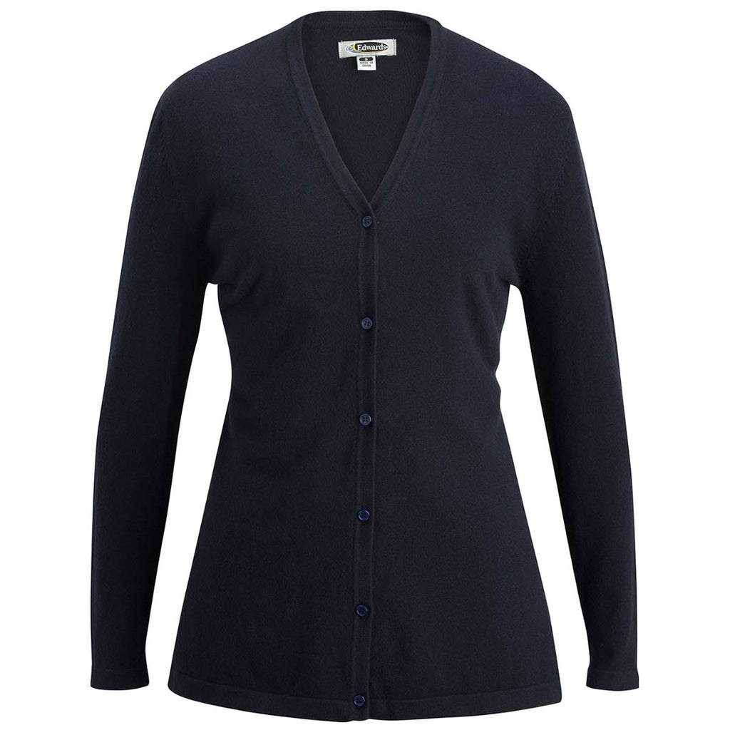 Create a custom look that will be envied with the Edwards Women's Navy V-Neck Long Cardigan. Made of a cotton rich, acrylic, and nylon blend in a lightweight long cardigan style. The dyed to match buttons and smooth finish with tubular cuffs, side vents, and traditional V-neck creates a look that works as employee apparel or as part of hospitality apparel for those who interact with customers daily. Your corporate embroidery will stand out on the flattering silhouette that can be used at home or the office with ease.Highlights