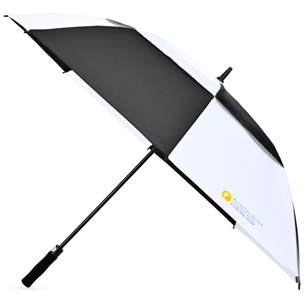 Try a corporate logo for the Elements Black/White 60" Recycled Auto Open Double Canopy Golf Umbrella to get your brand recognized in a fun and functional way. The colorful umbrella can be sold in pro shops and sporting goods stores or given as a gift to those who love spending time outdoors on or off the greens.