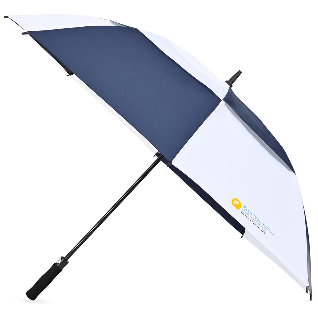 Try a corporate logo for the Elements Navy/White 60" Recycled Auto Open Double Canopy Golf Umbrella to get your brand recognized in a fun and functional way. The colorful umbrella can be sold in pro shops and sporting goods stores or given as a gift to those who love spending time outdoors on or off the greens.