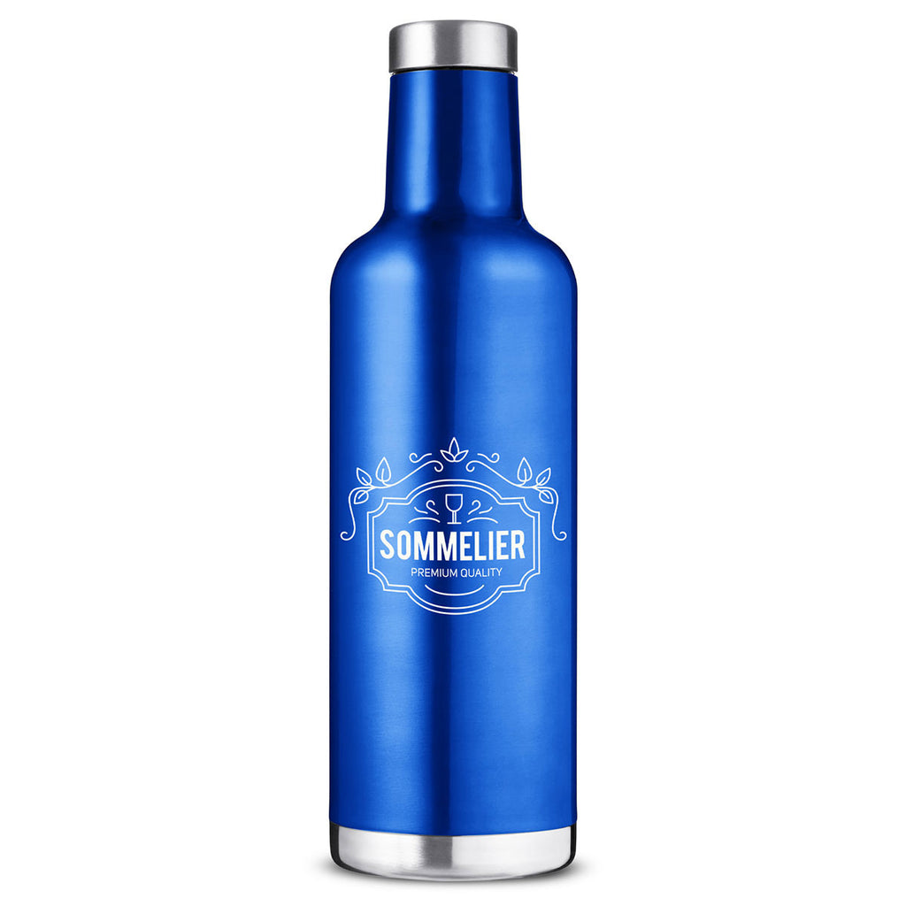 The Primeline Reflex Blue 25 oz. Alsace Vacuum Insulated Wine Bottle is a beverage container with upscale appeal. For an employee appreciation gift or event giveaway item that will make your company's custom logo look impeccable, consider adding it to this vacuum insulated beverage container's stainless steel exterior.The minimum order for this product is 25 pieces.