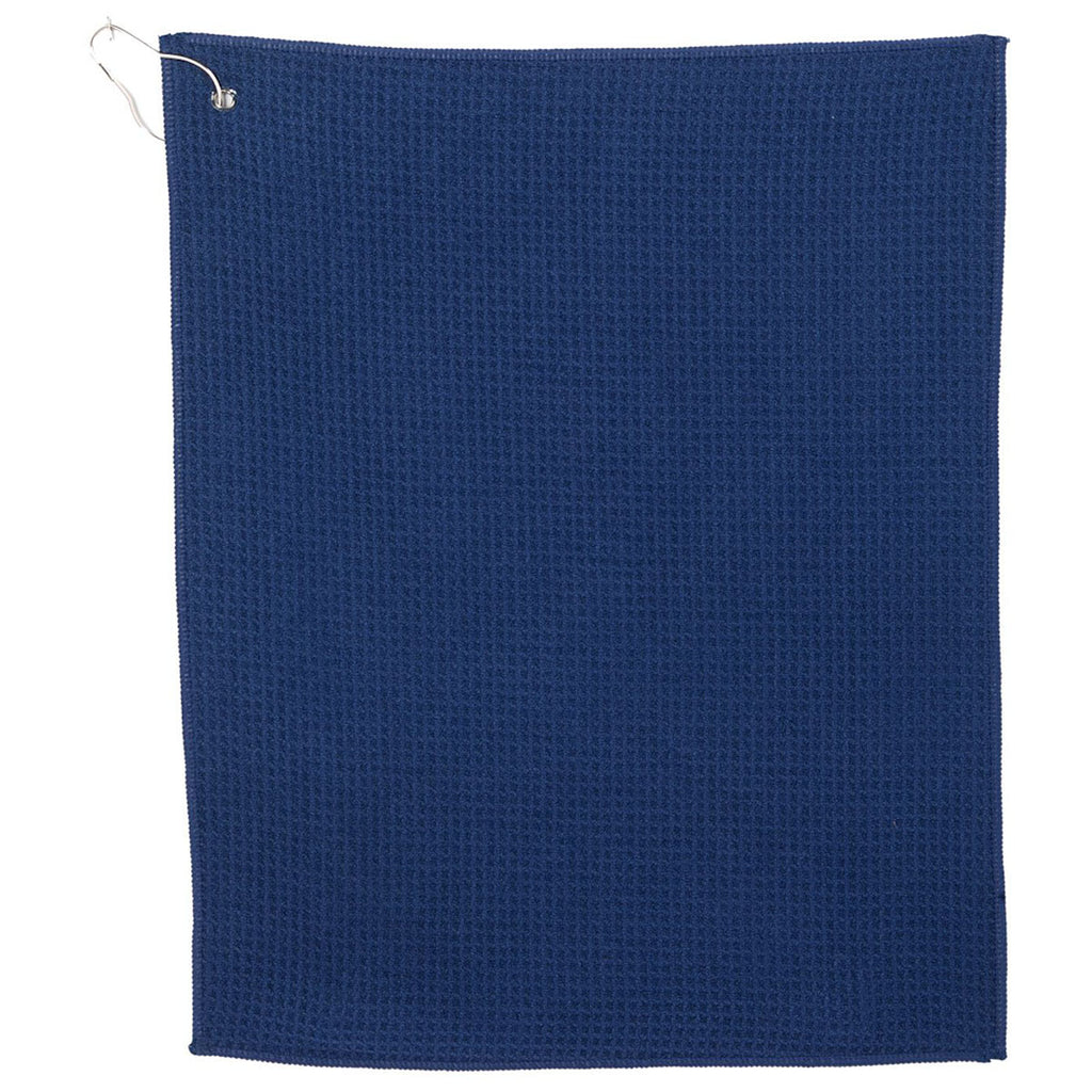 Add your corporate design to the Leed's Navy 15" x 18" RPET 200g Microfiber Waffle Towel to sell at your pro shop or gift to the golfers in your life. The convenient waffle towel is sized for on-course cleaning and drying, while the metal grommet and hook can easily be attached to your golf bag for fast access.The minimum order for this product is 100 pieces.