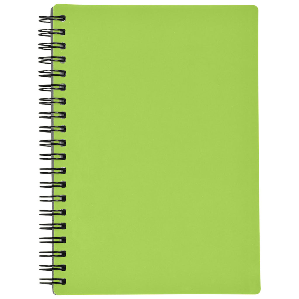 Hit Lime Green Rubbery Spiral Notebook with a corporate logo is a convenient way to take notes and stay organized. The 70 page lined notebook has a PVC cover and cardboard back to showcase your brand. Ideal for use in large meetings, to use at recruitment events, or offer to new clients as a welcome.