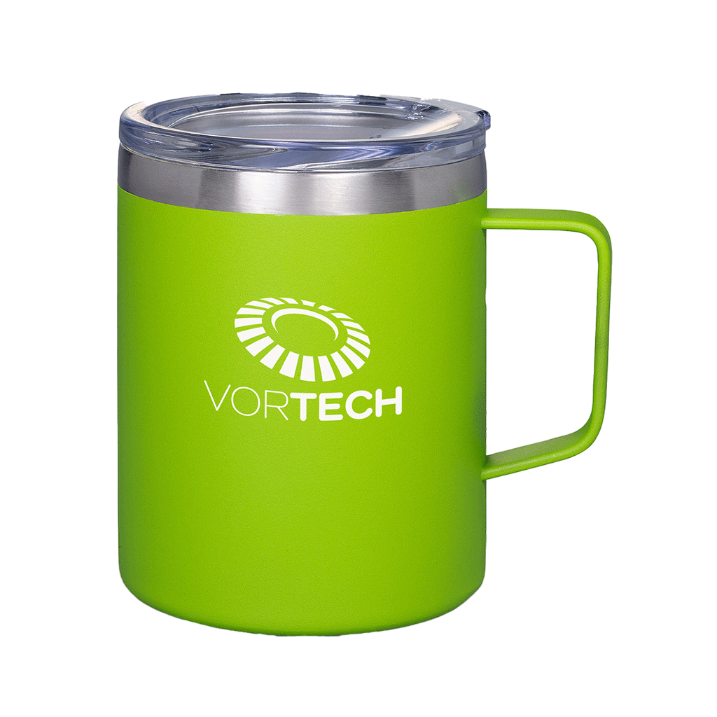 The Primeline Lime Green 12 oz. Vacuum Insulated Coffee Mug with Handle is the perfect way for your employees or audience members to take their morning coffee - and your company's custom logo - along with them when on the go. This contemporary mug also comes in a variety of bright, eye-catching colors.The minimum order for this product is 25 pieces.