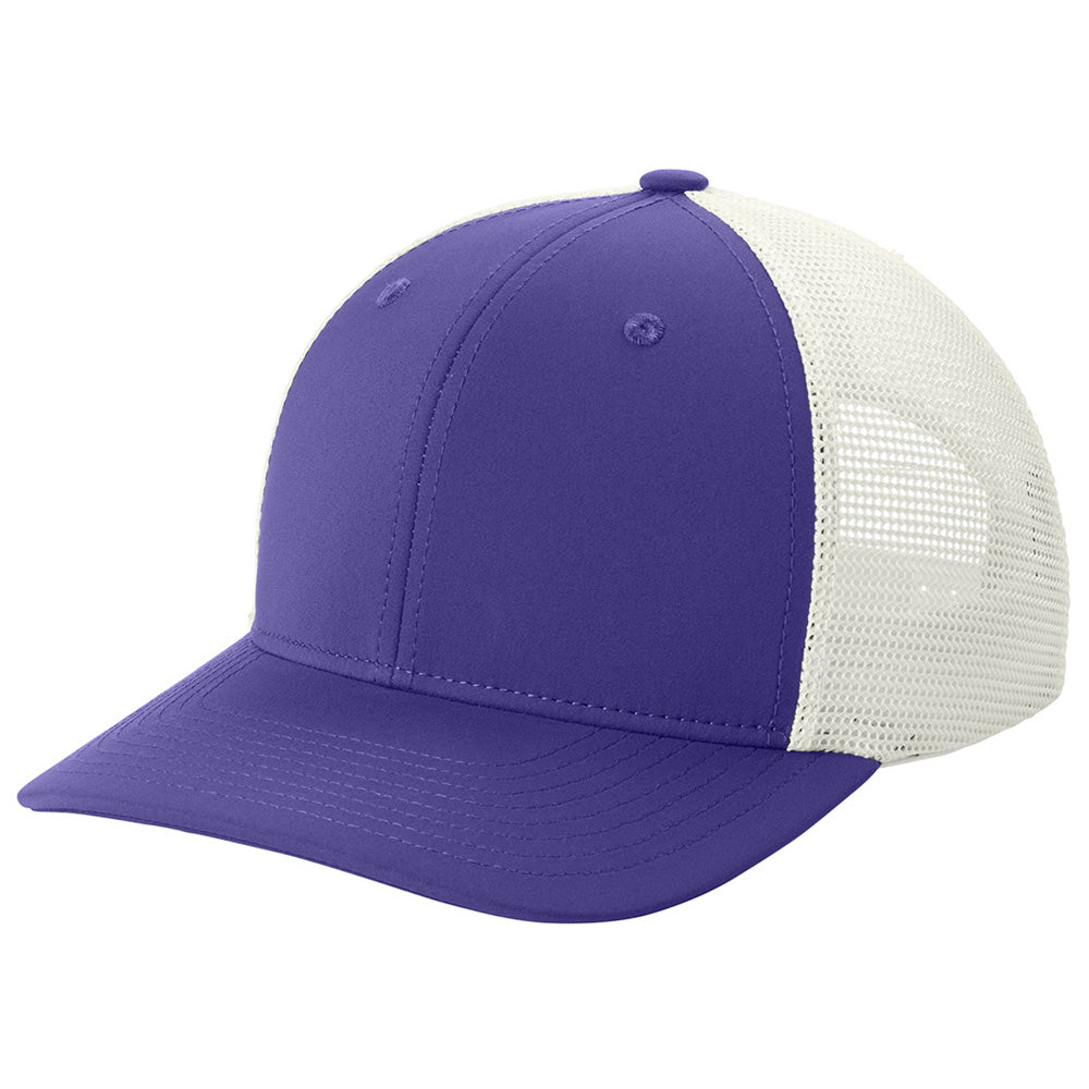 Add your custom logo to the Sport-Tek Purple/ White Club Trucker Cap to make sure your brand gets recognized. This one-size-fits-most cap is adjustable with a snapback closure in true trucker style. The structured, mid-profile with mesh backing has a curved bill and moisture-wicking sweatband. Great as a promotional item.Highlights