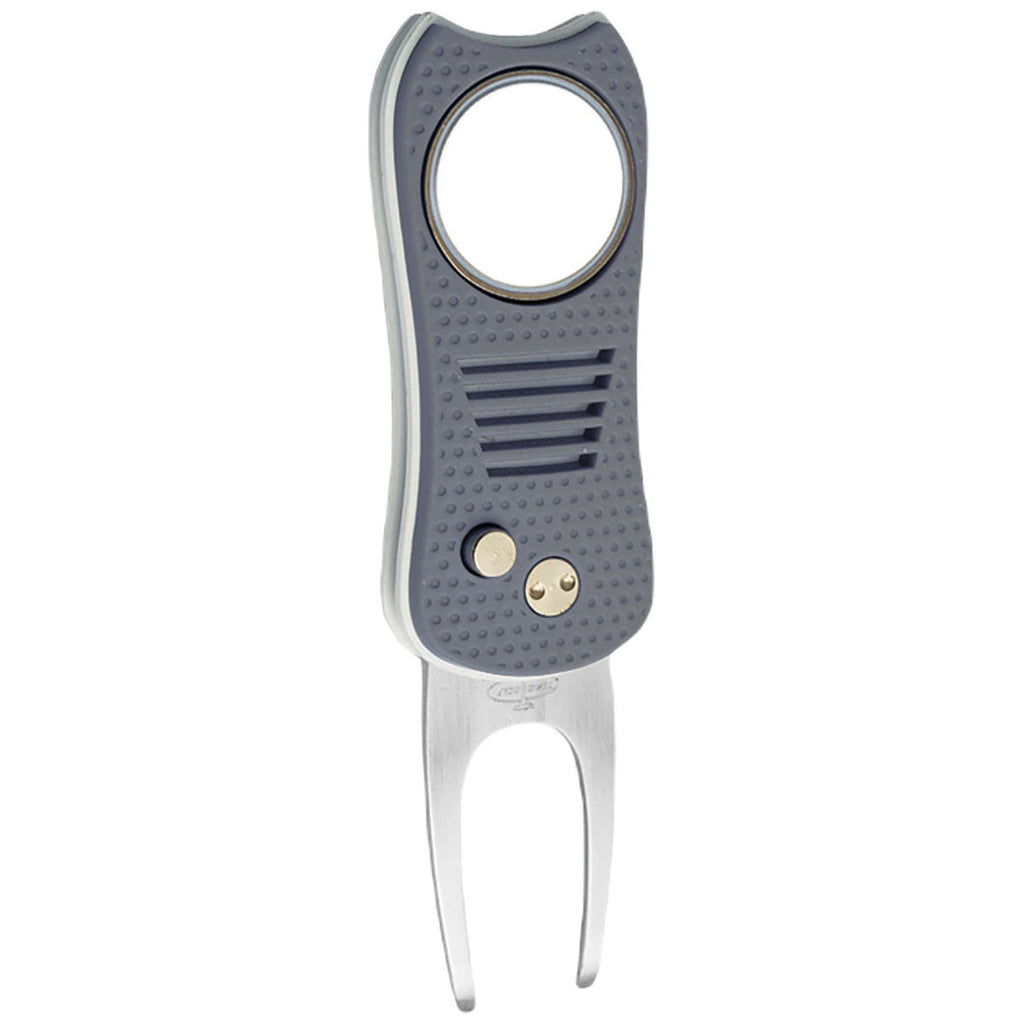 The Par One Grey Team Golf Switchblade Divot Tool is a multipurpose item that everyone who loves to golf will want to get their hands on. This little tool comes complete with a lightweight aluminum blade, a soft grooved handle, and a double-sided removable magnetic ball marker - all its missing is your company's custom logo or design.Highlights