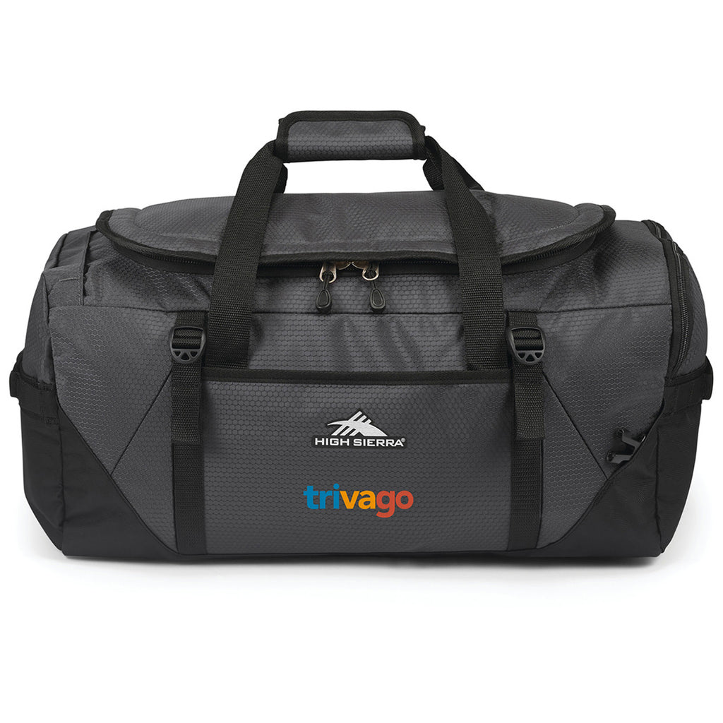 High Sierra Mercury/Black Fairlead Convertible Duffel with a custom logo is an upgraded classic that will keep you organized and ready to go. Perfect for overnight travel, gym clothes, or even overnight sporting events, this duffle converts to a backpack when needed for easy transport. Choose this durable option for your next adventure.