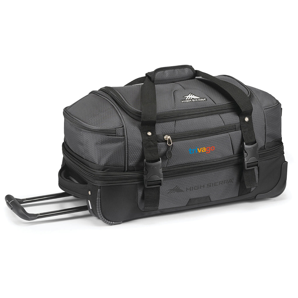 Go on a weekend adventure with a custom High Sierra Mercury/Black Fairlead 22" Drop Bottom Wheeled Duffel in mercury/black. This smaller duffel is perfect for those last-minute fun trips with friends or family. Toss in your favorite outfits and wheel your way to wherever you are headed. Great as a gift for those who love to have fun.