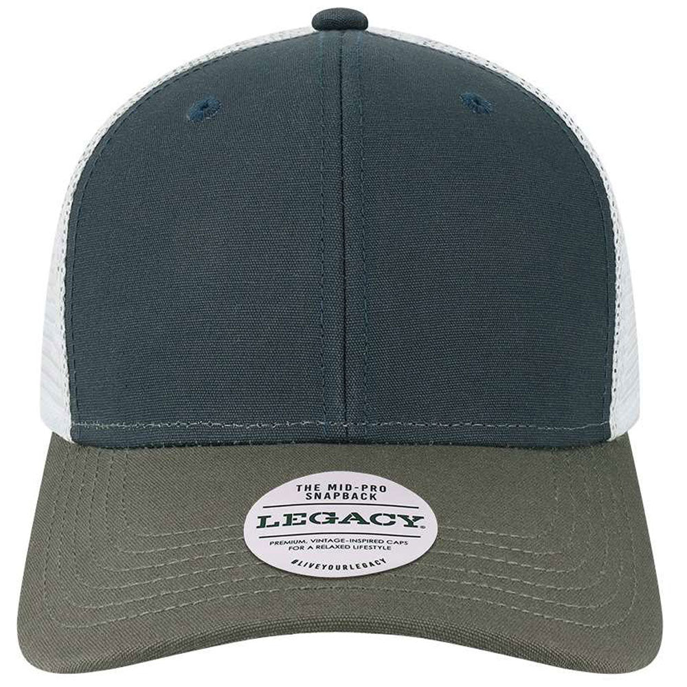 Create a promotional accessory that is big on vintage inspired by style adding your company's custom logo or design to the front of the Legacy Navy/Dark Grey/Silver Mid-Pro Snapback Trucker Cap. Classic details like a mesh back and adjustable snapback make it perfect for audiences of all ages.Highlights