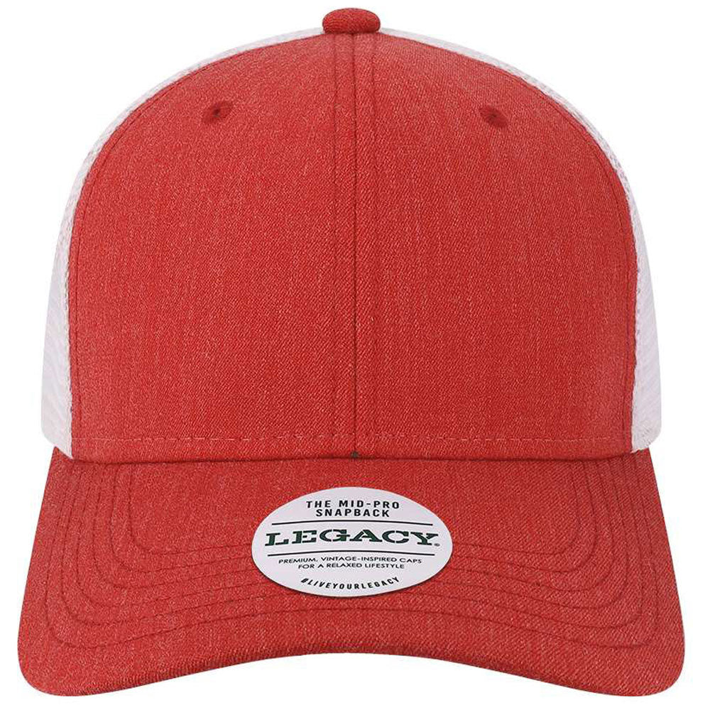 Create a promotional accessory that is big on vintage inspired by style adding your company's custom logo or design to the front of the Legacy Melange Scarlet/White Mid-Pro Snapback Trucker Cap. Classic details like a mesh back and adjustable snapback make it perfect for audiences of all ages.Highlights