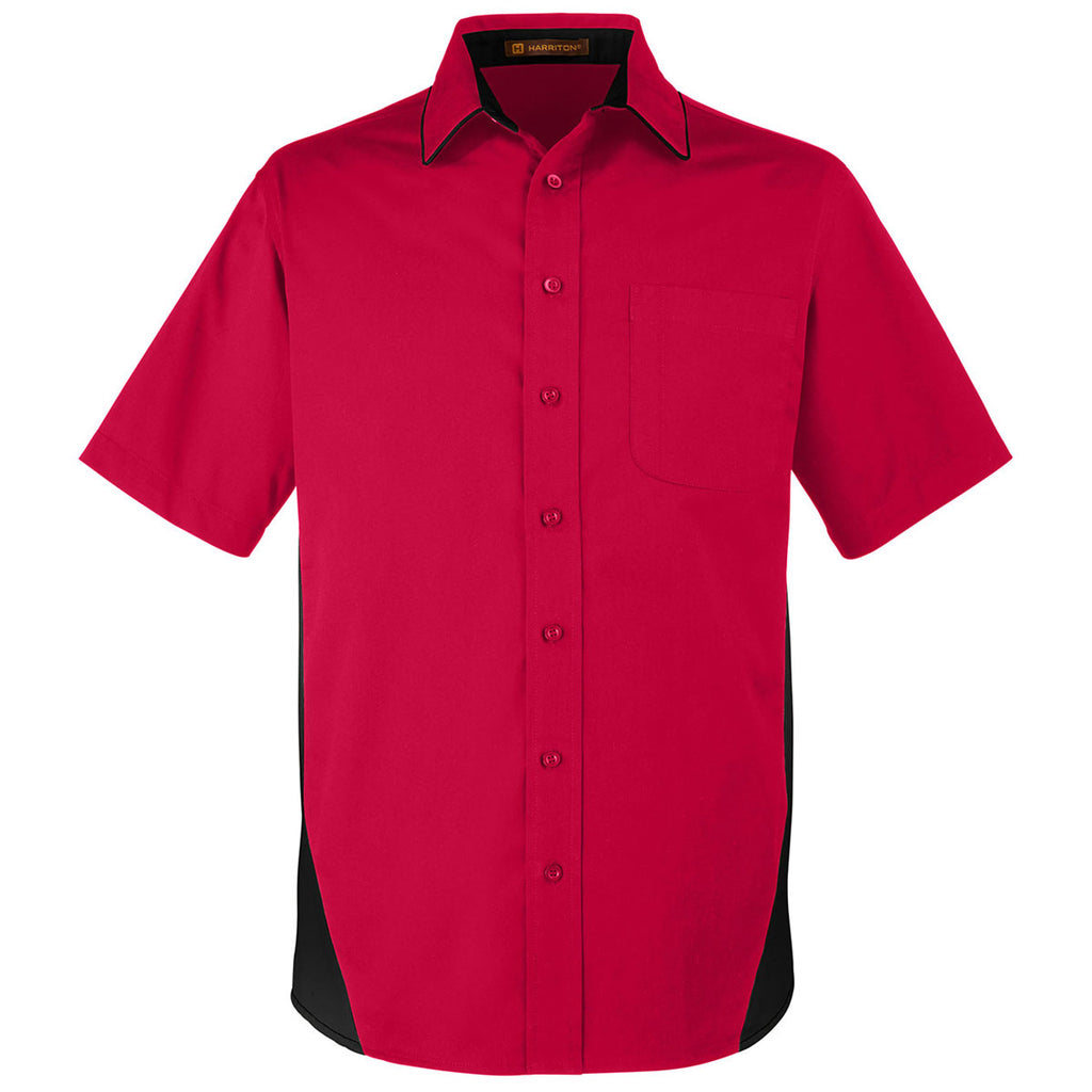 Enjoy a company logo on the Harriton Men's Red/Black Tall Flash Colorblock Short Sleeve Shirt to create employee apparel that can be worn as is or dressed up as corporate apparel as well. The short sleeve button up shirt is made of a cotton polyester twill blend with wrinkle resistance and stain release for day to day wear. Contrast details in all the right places create a unique look in this shirt that is available in tall sizes to find a proper fit for all. Ideal as employee gifts with a custom logo or to share with family and friends this shirt works well for many wardrobes.Highlights