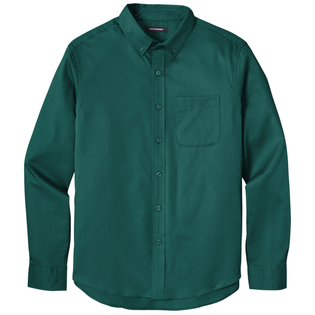 Performance meets fashion in the custom Port Authority Men's Marine Green Long Sleeve SuperPro React Twill Shirt. This wrinkle resistant button down is perfect for the office, but easily transitions to out and about. Add a company logo to use as corporate apparel for yourself or an entire company or for special events. Try a custom logo to build up your own wardrobe in a variety of colors or to add to your logoed apparel line. The button down shirt with button down collar and adjustable cuffs is ideal for the office, but can be nicely paired with a suit or jacket for a nice dinner out with family and friends.Corresponding Women's Style:Port Authority Women's Marine Green Long Sleeve SuperPro React