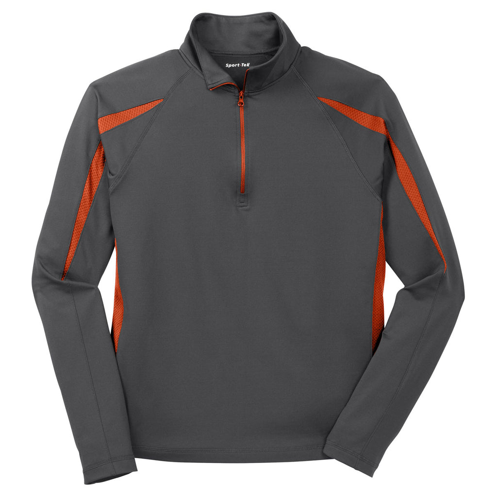 When the weather gets tough, so must you. That's the idea behind this Sport-Tek Men's Charcoal Grey/ Deep Orange Sport-Wick Stretch 1/2-Zip Colorblock Pullover. Add your own custom embroidery to make this a piece of corporate apparel that anyone can enjoy. Layering is ideally suited to serve as your canvas, and this is an item that will work for you in the elements, not against.Highlights