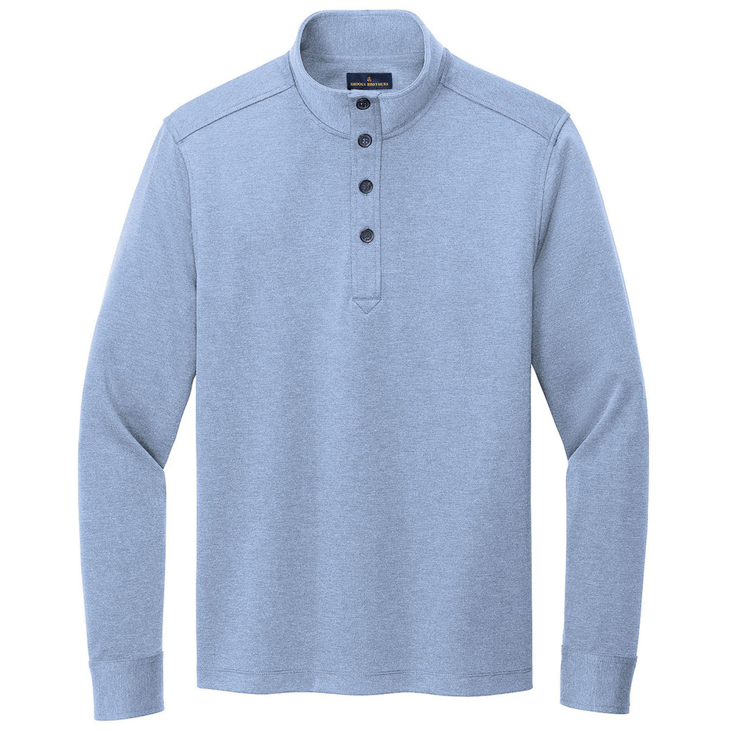 Design a custom embroidery for the Brooks Brothers Men's Aegean Blue Heather Mid-Layer Stretch Half Zip for a look that will take you places. The double-knit style is luxuriously soft and forgoes the typical half-zip style for a button vent with a cadet collar and rounded button cuffs that can be worn long or rolled up. Add a company logo to use as employee gifts or simply enjoy on your own while at the driving range or clubhouse. Order today.