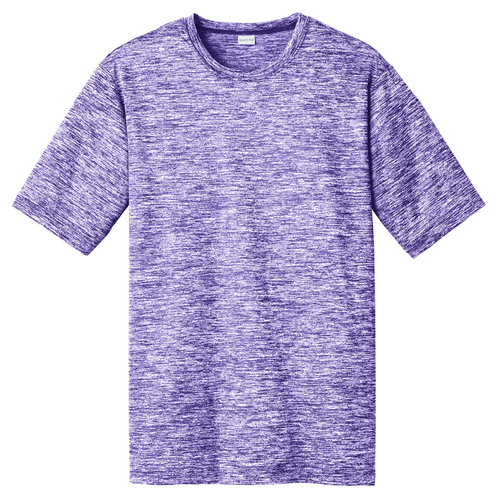 Do moisture laden t-shirts bog you down whenever you need to ramp up the competitive juices? Sport-Tek Men's Purple Electric PosiCharge Electric Heather Tee contain moisture wicking technology that quickly evaporates perspiration the instant it forms on your skin. The result is a cooling of the skin that invigorates your body. Set-in sleeves allow for more arm movement, which comes in handy on the golf course and tennis court. The super soft fabric endures countless wash and dry cycles, without any of the colors fading. One-hundred percent rugged polyester interlock resists rips and tears. Attach your company logo to the t-shirts to spread the word about your brand.Corresponding Women's Style: Sport-Tek Women's Purple Electric Electric PosiCharge Electric Heather Sporty Tee