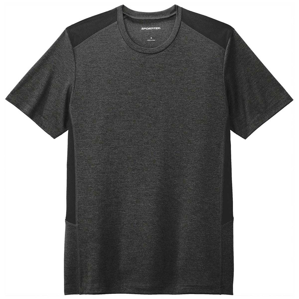 Look and feel great in a custom logo Sport-Tek Men's Black Heather/Black Endeavor Short Sleeve Tee. This unique tee has a subtle heather coloring that helps you stand out whether in the office or at the gym. Add a heat transfer company logo to use these for company uniforms or a custom design to utilize as employee gifts. Moisture wicking technology and breathability make these perfect for team events. The small extras like a tag free label and mesh panels at the shoulders and underarms mean you and your teammates will enjoy freedom of movement while staying cooler than the competition.Corresponding Women's Style: Sport-Tek Women's Black Heather/Black Endeavor Short Sleeve Tee