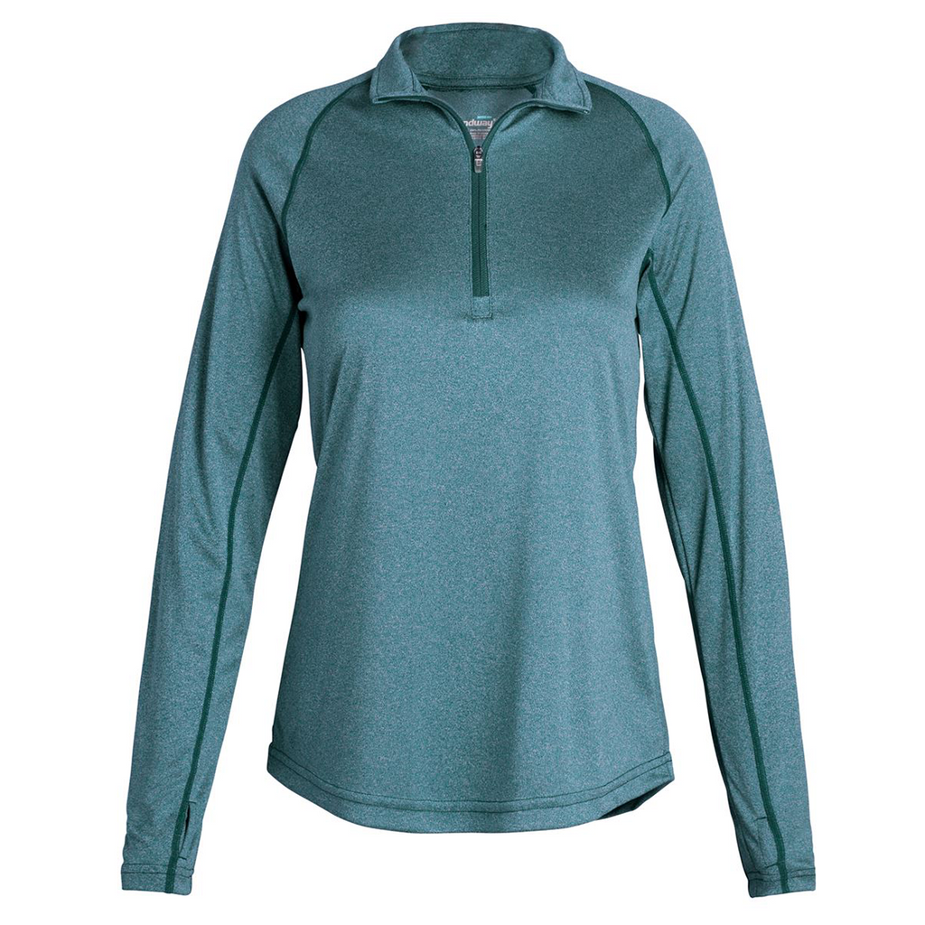 Active Cry moisture management technology produces maximum comfort for the corporate logoed Landway Women's Heather Emerald Apex Baselayer Active Dry Pullover. The quarter-zip pullover includes a large imprint area where you attach a custom logo. With a logo displayed, you reach more potential customers at civic and professional networking events. Flat lock seam stitching resists rips and tears to ensure you enjoy years of stylish use. The athletic fit makes the pullover ideal for participating in outdoor sporting competitions. Enjoy the smooth comfort provided by the sleek tricot-lined inner collar. The tagless label eliminates the itching sensation caused by attached labels.Corresponding Men's Style: Landway Men's Heather Emerald Apex Baselayer Active Dry Pullover