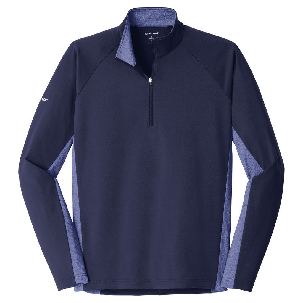 The embroidered Sport-Tek Men's True Navy/True Navy Heather Sport-Wick Stretch Contrast 1/2-Zip Pullover makes a bold fashion statement that your peers will remember at the next corporate event. Add a custom logo on the large imprint area to take advantage of the lasting impression you leave on customer prospects who attend industry trade shows. Outfitted with the combination of smooth heather and a solid color that includes reflective details for late night workouts. Ninety percent polyester ensures durability, while spandex mixes in to increase movement flexibility during your busy day both at the office and after hours. This layering piece is one that all of your employees will actually enjoy wearing.Corresponding Women's Style:Sport-Tek Women's True Navy Heather Sport-Wick Stretch Contrast 1/2-Zip Pullover