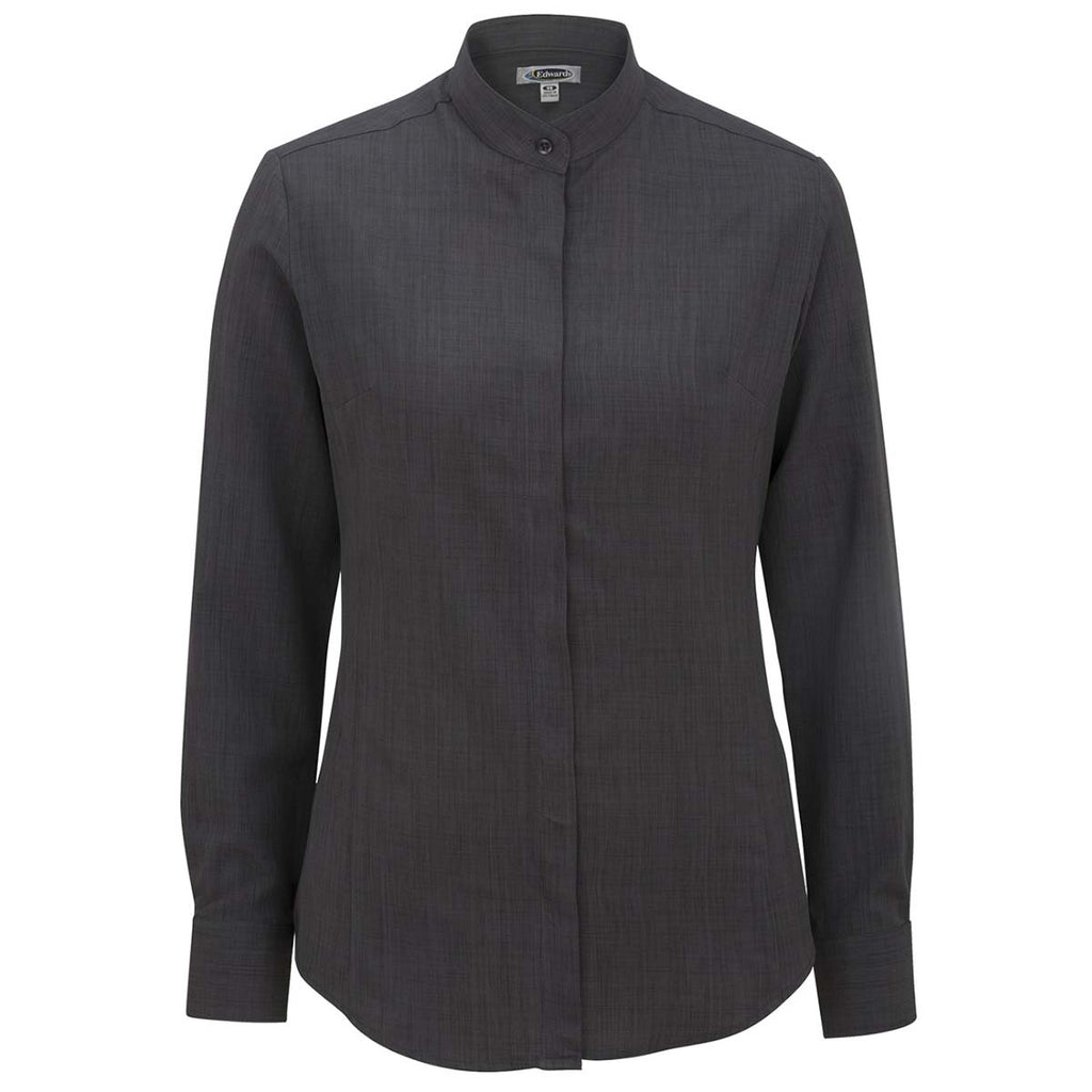 Enjoy all day custom comfort with the Edwards Women's Steel Grey Batiste Banded Collar Shirt with contemporary pattern accents on a soft, supple polyester fabric. The ideal choice for hospitality apparel for those working in resorts, hotels, or restaurants, this long sleeve dress shirt has a covered placket with unique banded collar that creates a flattering silhouette. Easy to laundry these shirts are wrinkle resistant, moisture wicking, and offer soil release in an easily embroidered material. Add your corporate embroidery or custom logo to improve employee visibility even at large events.Highlights