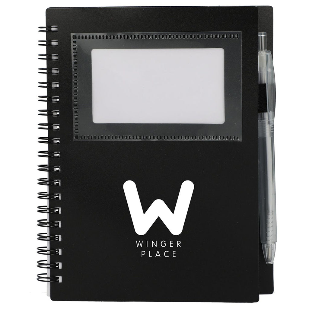Great for tradeshows, meetings, and other industry events, the Bullet Black Recycled Star Spiral Notebook with Pen will show off your logo while also providing your team everything they need to stay organized. This customizable notebook features a blue ink pen with integrated loop and a front pocket for storing business cards.