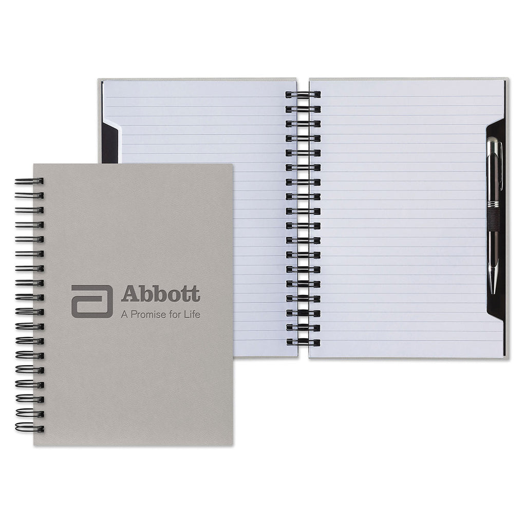 Ensure your company's employees and customers are thrilled beyond "words" on their journals with the Castelli Light Grey Tucson Scribe Wire Journal! It flaunts a cover with smooth soft texture that looks like genuine leather. Features include 288 white pages printed in modern grey, pen loop, inserted pen, and a silver ribbon marker. Customize it with your brand name or logo to show customers you mean business.